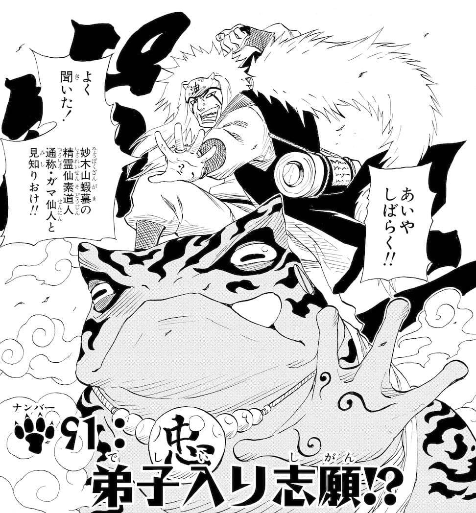 ちなみに、『NARUTO-ナルト-』で自来也が初めて登場したこのシーン。「妙木山蝦蟇の精霊仙素道人 通称・ガマ仙人」と自己紹介をしていますよね。