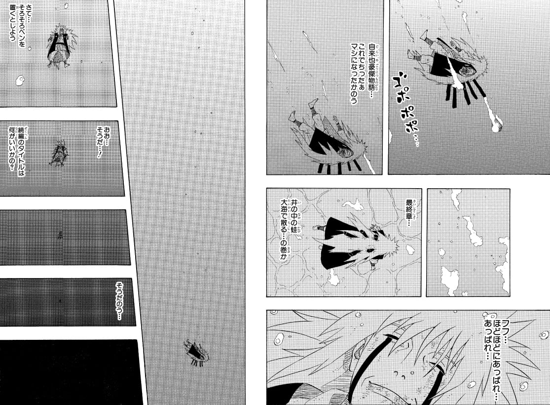 日野原:『NARUTO-ナルト-』で自来也が亡くなるシーンも『児雷也豪傑譚』との強いつながりを感じます。彼は死ぬ間際に「自来也豪傑物語…これでちったぁマシになったかのう」と言い、水底へと沈んでいく。江戸時代の『児雷也豪傑譚』も未完で終わっているけれど、『NARUTO-ナルト-』で自来也が書いていた小説も、ある意味未完なんです。