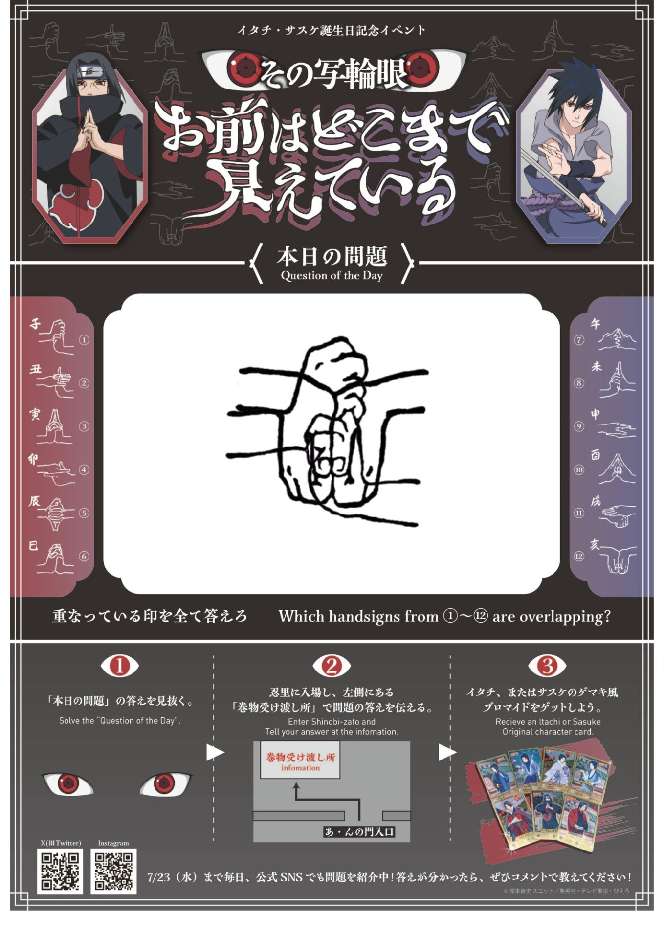 見事に全ての印を見抜いた方には、「NARUTO&BORUTO 忍里」限定、「サスケ」「イタチ」のどちらか好きなゲマキ風オリジナルブロマイドをプレゼントいたします。