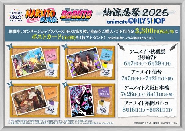 開催店舗にて<『NARUTO‐ナルト‐ 疾風伝』『BORUTO‐ボルト‐ NARUTO NEXT GENERATIONS』POP UP STORE ~納涼忍祭2025~>関連のキャラクターグッズを1会計3,300円(税込)以上ご購入でポストカード(全4種) を1枚プレゼント!